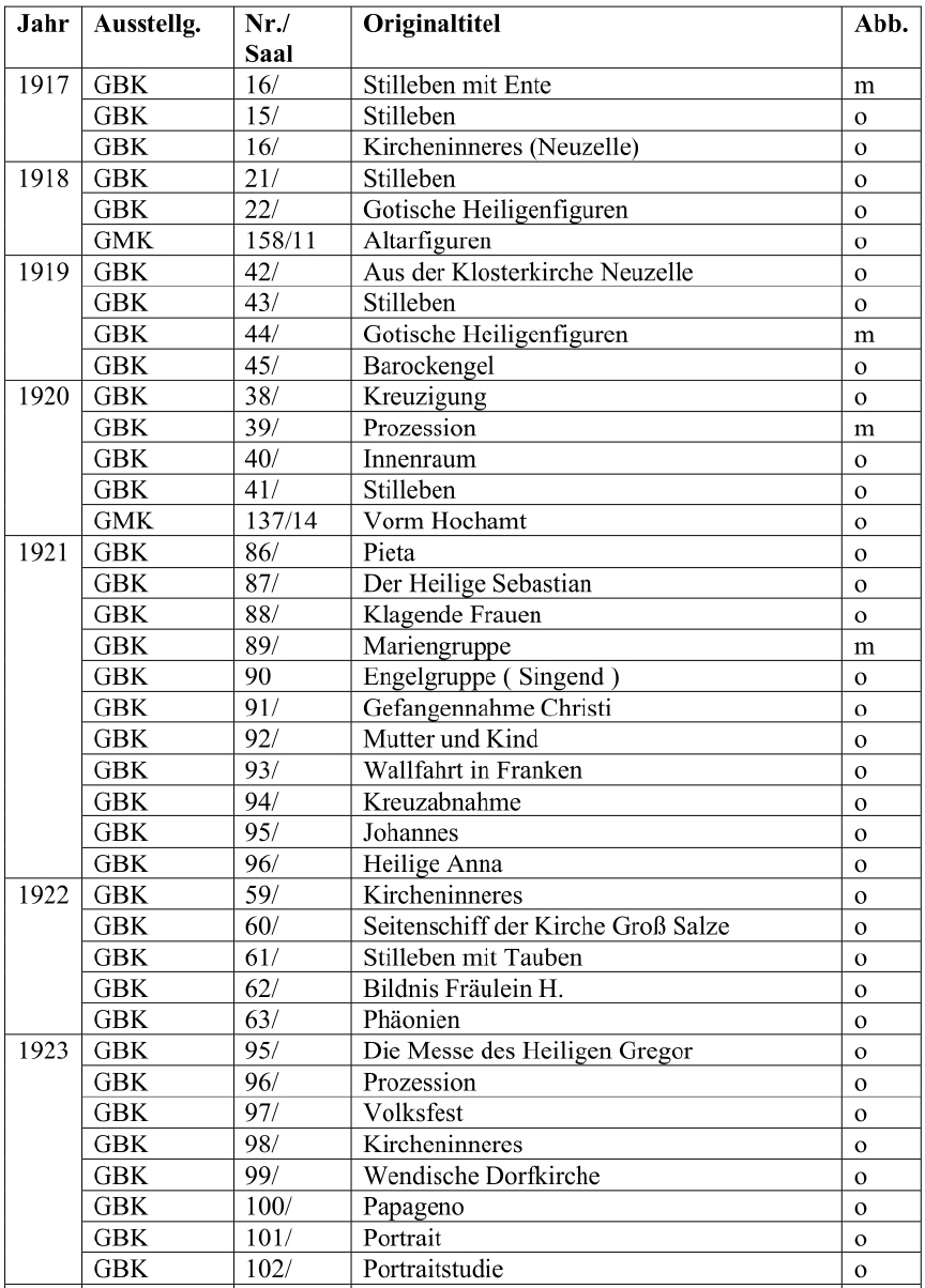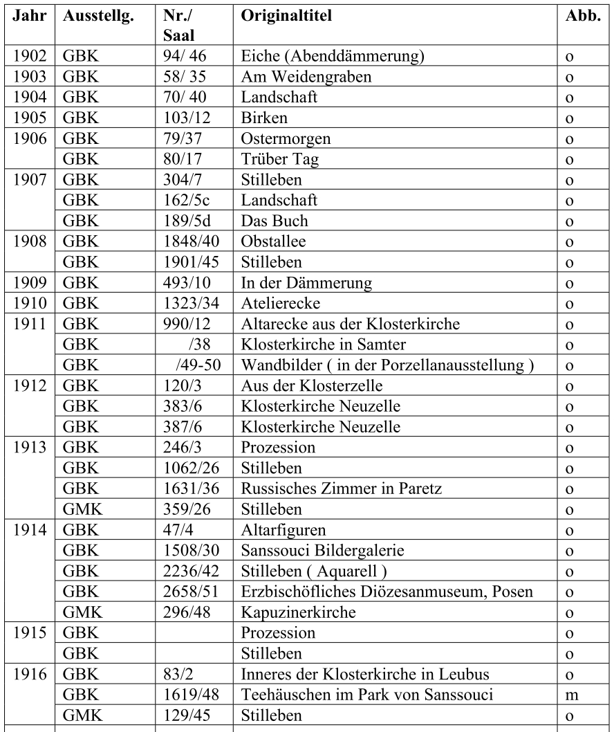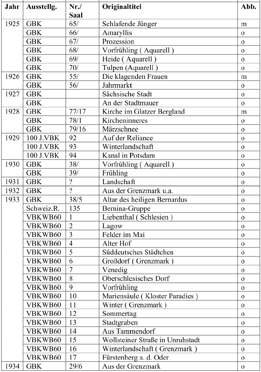 1911 Kunstsalon Theodor Lichtenberg, Breslau; Kunsthalle, Wilmersdorf. 1912 VBK Künstlerhaus, Berlin; Palais Lipperheide, Berlin; Kunstsalon Schulte, Berlin, Düsseldorf, Köln; Salon Werckmeister, Berlin. 1913 Galerie Arnold, Breslau; Verein Danziger Künstler, Peinkammer, Danzig; Kunstsalon Schulte, Düsseldorf; Salon Werckmeister, Berlin. 1914 VBK Künstlerhaus, Berlin; Kunstsalon Schulte, Berlin, Düsseldorf; Galerie Wertheim, Berlin; Kunsthütte, Chemnitz; Salon Mehnert, Posen; Galerie A. Lichtenberg, Breslau; Galerie Banger, Wiesbaden. 1915 Galerie A. Lichtenberg, Breslau; Kunstsalon Schulte, Berlin; Galerie Wertheim, Berlin. 1916 Galerie Wertheim, Berlin; Neues Museum, Wiesbaden; Galerie Gerstenberger, Chemnitz. 1917 VBK Künstlerhaus, Berlin; Kunstsalon Schulte, Berlin; Galerie A. Lichtenberg, Breslau. 1918 Kunstsalon Schulte, Berlin (2x); Galerie Dahlheim, Berlin; Kunstakademie, Dresden; Kunstverein, Cottbus. 1919 VBK Künstlerhaus, Berlin; Akademie der Künste, Berlin; Kunstsalon Schulte, Berlin; Galerie Gelb, Berlin. 1920 Akademie der Künste, Berlin; Kunstsalon Schulte, Berlin; Galerie Gelb, Berlin; Kollektivausstellung 12ter Bezirk, Gymnasium Lankwitz, Berlin; Große Kunstausstellung, Kunstpalast, Düsseldorf. 1921 Kunstsalon Schulte, Berlin; Parthenon, Berlin-Tempelhof; Galerie Gerstenberger, Chemnitz. 1922 Große Kunstausstellung, Kunstpalast, Düsseldorf; Kunstsalon Schulte, Berlin; Rathaus Berlin-Steglitz, Weihnachtsausstellung. 1923 Künstlergilde, Berlin; Rathaus, Berlin-Schöneberg. 1924 Kunsthandlung B. Scholz, Berlin-Steglitz. 1925 VBK Künstlerhaus, Berlin; Kunstsalon Schulte, Berlin (3x); Künstlergilde, Berlin; Rathaus Berlin-Steglitz, Weihnachtsausstellung. 1926 VBK Künstlerhaus, Berlin; Rathaus Berlin-Steglitz, Weihnachtsausstellung. 1927 Kunstsalon Schulte, Berlin; Rathaus Berlin-Steglitz, Weihnachtsausstellung. 1928 VBK Künstlerhaus, Berlin; Rathaus Stadt Berlin; Rathaus Berlin-Steglitz, Weihnachtsausstellung. 1930 Künstlergilde, Berlin; Stadtschloß, Berlin; Scherlhaus, Berlin; Rathaus Berlin-Steglitz, Weihnachtsausstellung. 1931 VBK Künstlerhaus, Berlin (2x); Scherlhaus, Berlin; Rathaus Berlin-Steglitz, Weihnachtsausstellung. 1932 VBK Künstlerhaus, Berlin (2x); Deutsche Kunstgemeinschaft, Stadtschloß, Berlin; VBK Gastausstellung im Glaspalast, Wien. 1933 VBK Künstlerhaus, Berlin; VBK in der Kunsthalle, Düsseldorf; Scherlhaus, Berlin. 1934 VBK Künstlerhaus, Berlin (2x). 1935 VBK Künstlerhaus, Berlin.