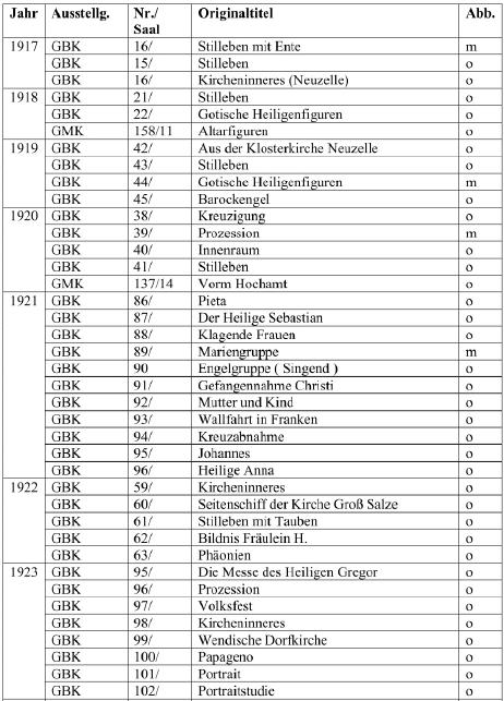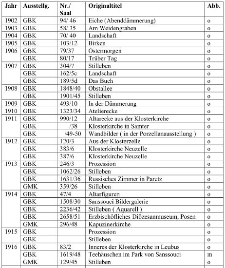 GBK = Große Berliner Kunstausstellung, Berlin-Moabit VBK= Verein Berliner Künstler 100 J.VBK= Jubiläumsausstellung 100 Jahre VBK VBKWB60= Wilhelm Blanke Jubiläumsausstellung zu seinem 60. Geburtstag Schweiz.R.= Schweizer Reisebüro Berlin GMK = Große Münchener Kunstausstellung