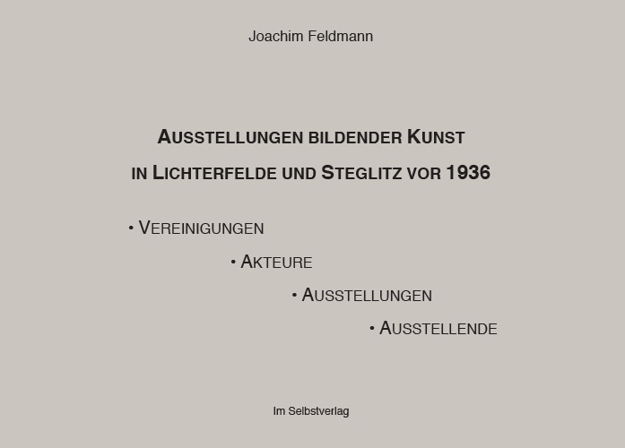 Feldmann, J.: Ausstellungen bildender Kunst in Lichterfelde und Steglitz vor 1936. DIN A4 quer, 184 Seiten (incl. 4 Abb., 11 Tabellen), Softcover, Selbstverlag, 2024.